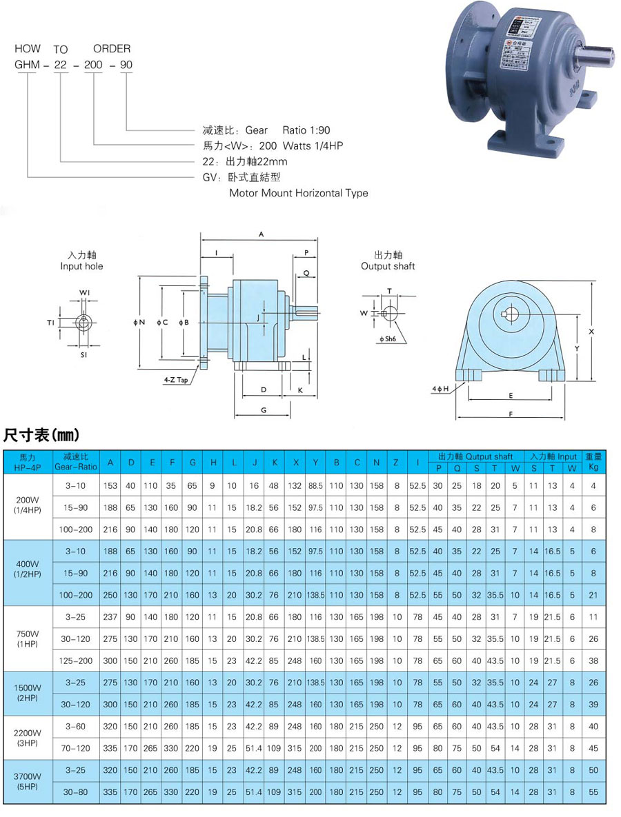 萬鑫GH-28減速機型號:GH18(輸出軸直徑)-100(電機功率)-20(減速比)S(S代表三相,A代表單相) |