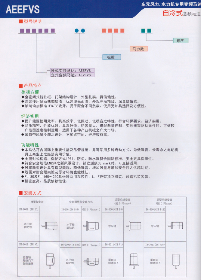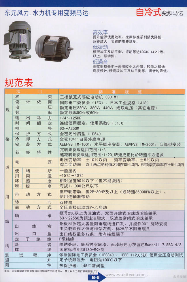 TECO東元變頻電機種類:三相鼠籠式感應電動機 保護方式:IP54:全密式 安裝方式:EVEF 水平腳座安裝(IM1001) EVVF 凸托架安裝(IM3001) 極數(shù):4P 6P 8P 額定輸出:1/2-125 1/4-100 25-60 馬達電源:3#220,380,415,440,460V 50 or 60HZ(其他電源) 時間額定:連續(xù)額定,使用系數(shù)S.F:1.0 轉(zhuǎn)矩特性:定轉(zhuǎn)矩負載適用范圍:1:10 遞減轉(zhuǎn)矩負載適用范圍:1:20,轉(zhuǎn)矩成正比與轉(zhuǎn)平 方遞減 啟動轉(zhuǎn)矩:125%額定轉(zhuǎn)矩 絕緣等級:F級(附熱保護器---常閉型) |